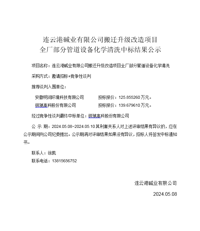 搬遷升級改造項目全廠部分管道設(shè)備化學(xué)清洗中標(biāo)結(jié)果公示