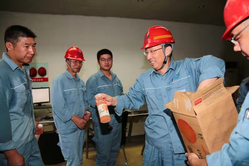 公司領導每到一處,親手將一瓶瓶清涼飲品送到大家手中,與現(xiàn)場人員一一握手,感謝大家在炎炎夏日仍不辭辛勞、堅守崗位,為全面完成各項目標任務所作出的奉獻,并叮囑他們在堅守崗位的同時注意安全生產,做好防暑降溫工作。他要求各單位要堅持“生命至上、安全發(fā)展”的理念,把各項安全生產防護措施落實落細,切實保障員工的身體健康,確保各項生產作業(yè)順利進行。