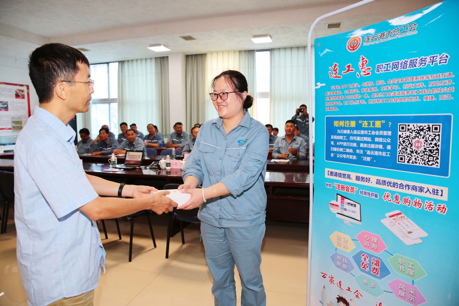 此次調(diào)研,孫月春副主席一行帶來三百余冊圖書贈(zèng)予公司職工書屋,進(jìn)一步豐富了公司職工的業(yè)余文化生活,并向參加連工惠抽獎(jiǎng)活動(dòng)獲獎(jiǎng)的我公司職工伏廣偉頒獎(jiǎng)。連工惠運(yùn)營人員針對“連工惠”平臺注冊相關(guān)事宜進(jìn)行了面對面指導(dǎo),并一一解答了現(xiàn)場參會(huì)人員提出的問題。