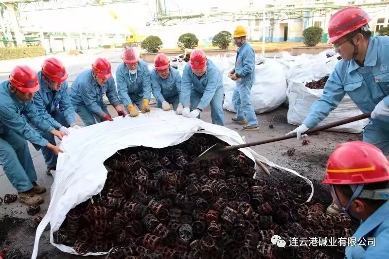 由于清理工作全靠人力完成,崗位人員一邊要維持生產,一邊要清理填料,工作量非常大。11月12日下午,公司黨委書記、董事長張衛(wèi)民在調研重堿車間生產現場時了解到這一情況后,當機立斷,立即組織公司領導及各部門黨員干部義務勞動,協助重堿車間完成鮑爾環(huán)填料清理回收工作。