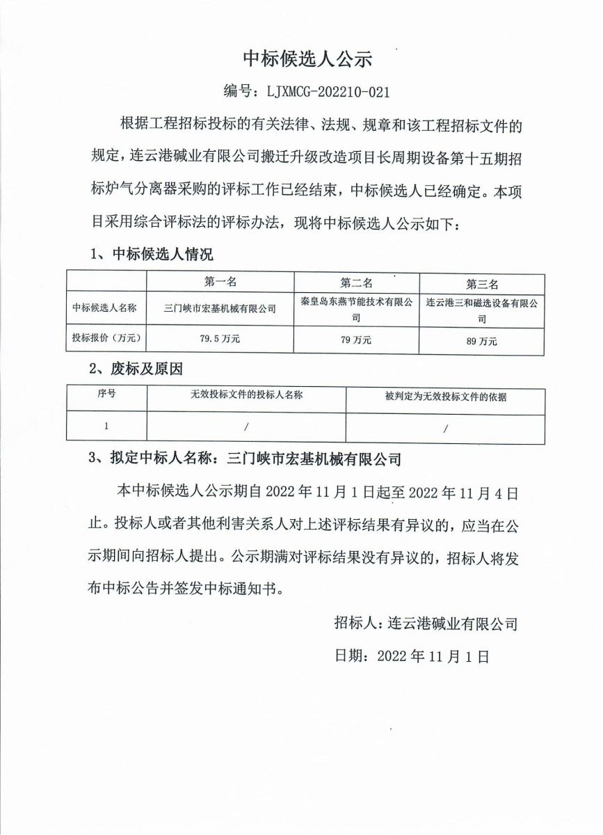 爐氣分離器采購(gòu)招標(biāo)中標(biāo)候選人公示