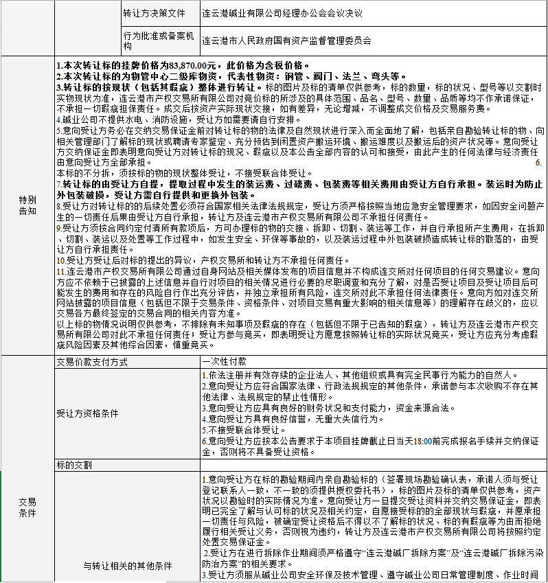 連云港堿業(yè)有限公司物管中心二級庫物資轉(zhuǎn)讓公告